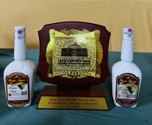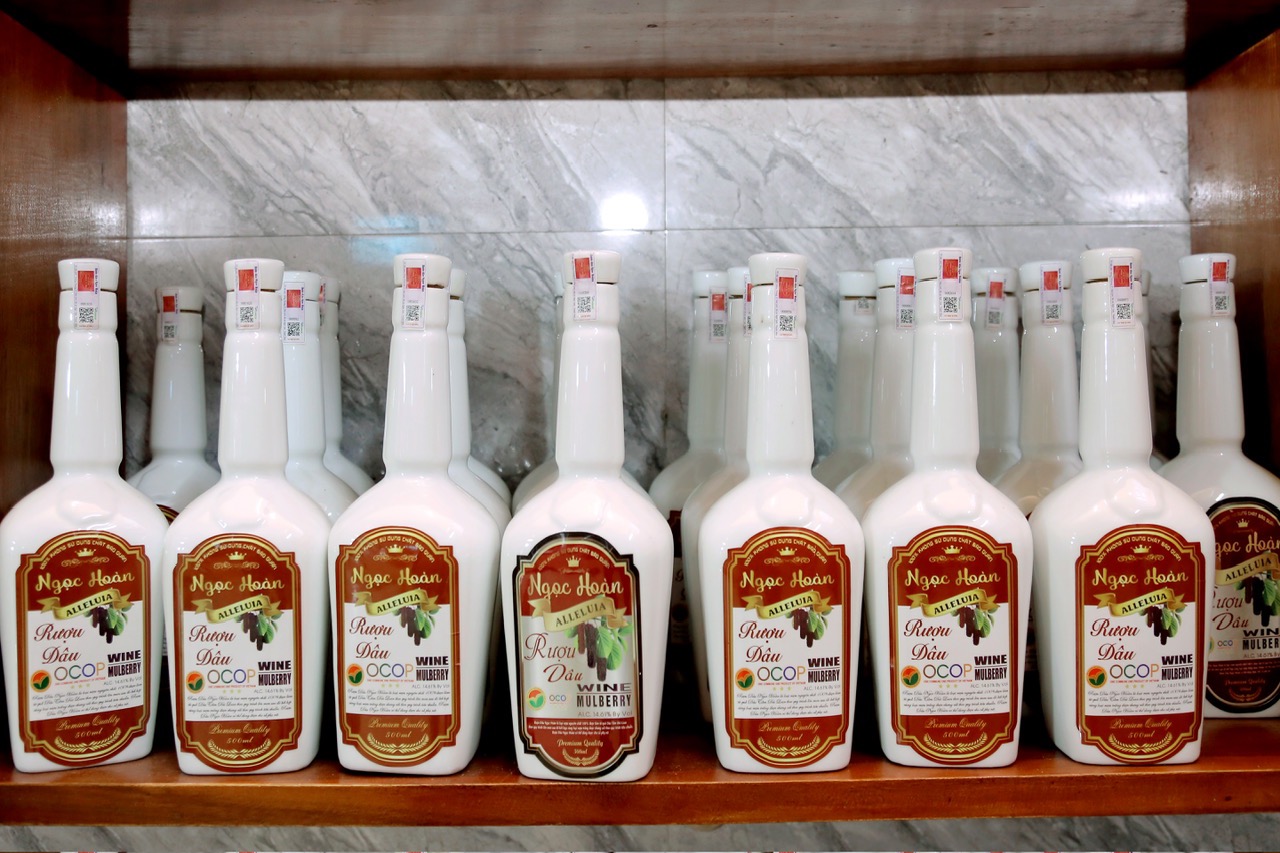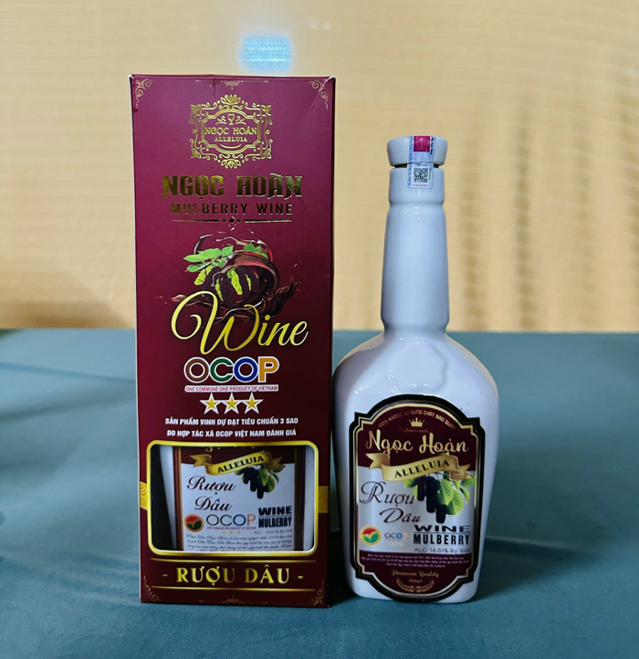 Sản phẩm rượu dâu Ngọc Hoàn đạt chất lượng 3 sao OCOP tỉnh Thanh Hóa. Với nguyên liệu gồm rượu gạo được nấu từ gạo Thái xuyên, men Hùng Huy Thái Bình 38 vị thuốc bắc được Bộ Y tế công nhận đạt tiêu chuẩn chất lượng về an toàn thực phẩm sau đó ngâm các loại quả như dâu ta, dâu tằm Đài Loan, hoa astiso, sim, mận Sơn La , nho Ninh Thuận không sử dụng chất bảo quản đảm bảo tiêu chuẩn vệ sinh an toàn thực phẩm, thời gian ngâm từ 6 tháng trở lên, rượu để càng càng ngon. Sau thời gian ủ rượu sẽ được xử lý qua máy lọc, máy khử độc tố, tạp chất xong cho vào trống gỗ sồi nhập khẩu và téc inox để chưng cất và bảo quản. Rượu dâu nhìn dưới ánh nắng có độ sóng sánh màu đỏ đẹp mắt, nước trong vắt. Khi uống vào sẽ cảm nhận được vị ngọt tự nhiên của hoa quả lên men tự nhiên, rất tốt cho sức khỏe nếu như dùng điều độ đúng lượng, không gây say như các loại rượu khác. Công dụng bổ máu bởi hàm lượng men tự nhiên và các vitamin khoáng chất trong rượu giúp làm ấm cơ thể, đả thông mạch máu, làm đẹp da, tăng sức đề kháng cơ thể.